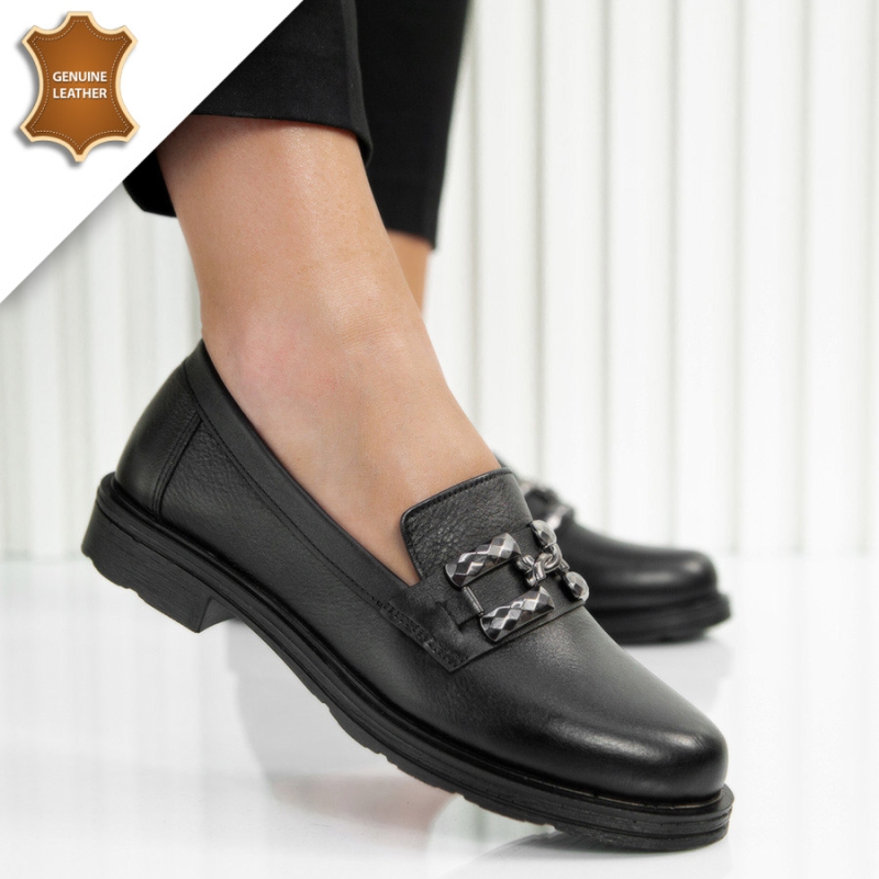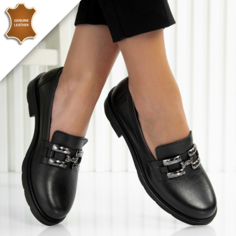 Модерни дамски обувки от естествена кожа в черен цвят с красива декорация отгоре . Моделът е изключително лек и удобен за носене и е едно прекрасно допълнение към вашата ежедневна визия. Подходящ за съчетание на всеки ежедневен тоалет.Опция преглед и тест преди плащане
