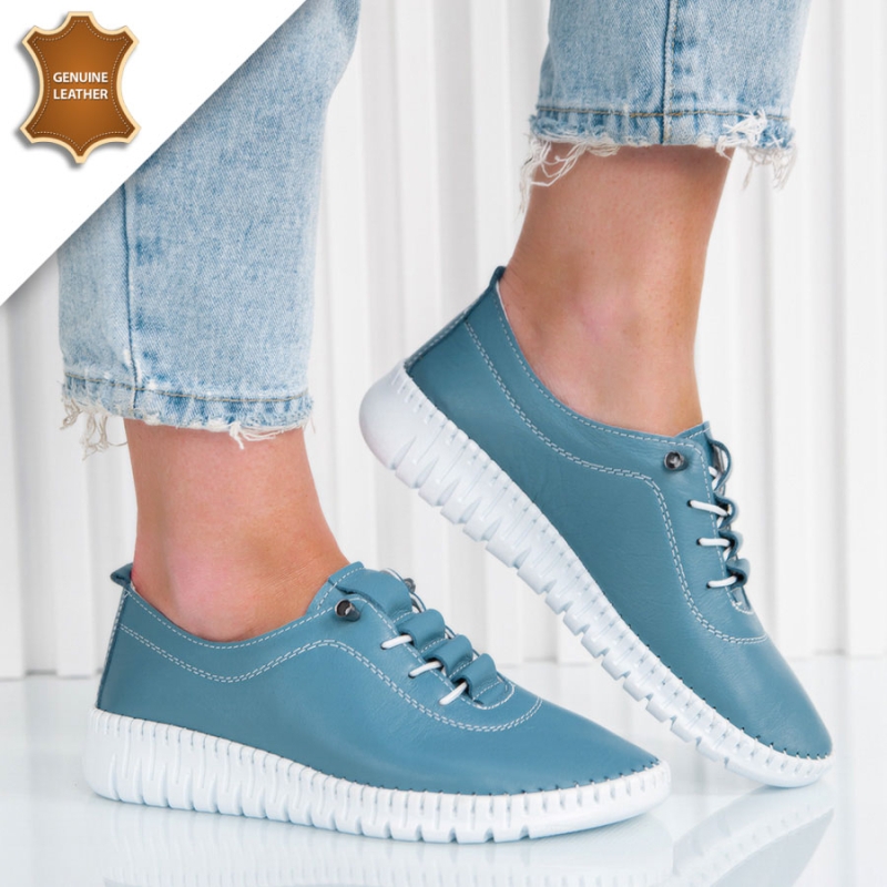 Комфортен нов модел ниски обувки, които ще ви снабди с удобството, от което се нуждаете в ежедневието си. Моделът е с изчистен дизайн и е изключително лек и удобен. Изработени са от висококачествена естествена кожа. Те са решени в син цвят. Обуването е улеснено от ластични връзки, които регулират ширината. Опция преглед и тест преди плащане.Произход-Турция.